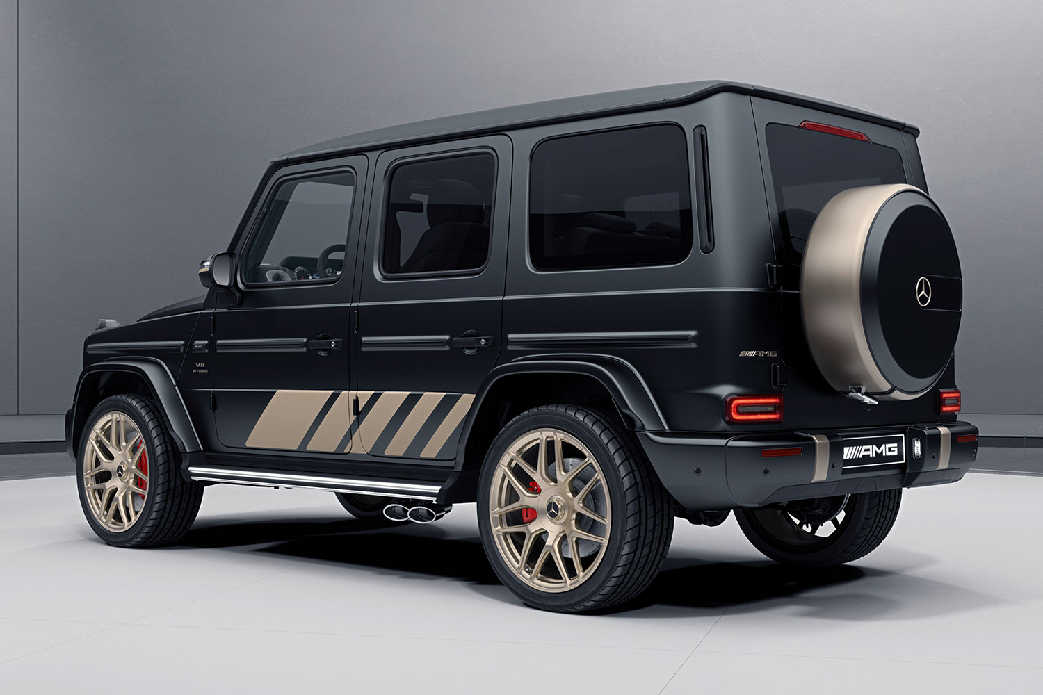 Die “Grand Edition” trägt erstmals das AMG-Logo und den Mercedes-Stern in Kalahari-Goldmagno. Auf der Motorhaube prangt das ikonische Affalterbach-Emblem der Performance-Marke, ebenfalls in Kalahari-Goldmagnum gehalten. Der ausdrucksstarke Charakter dieses Sondermodells wird durch 22-Zoll-AMG-Schmiederäder im faszinierenden Kreuzspeichendesign mit Tech-Gold-Finish und mattschwarzer Zentralverschlussmutter sowie einem faszinierenden Mercedes-Stern in Tech-Gold noch verstärkt. Ergänzt wird das Paket durch eine maßgeschneiderte AMG Indoor Car Cover, die mit einer atmungsaktiven, reißfesten Kunstfaser-Außenhülle und einer antistatischen Flanell-Innenhülle ausgestattet ist, um das Fahrzeug vor Staub und Kratzern zu schützen, während es in der Garage steht.