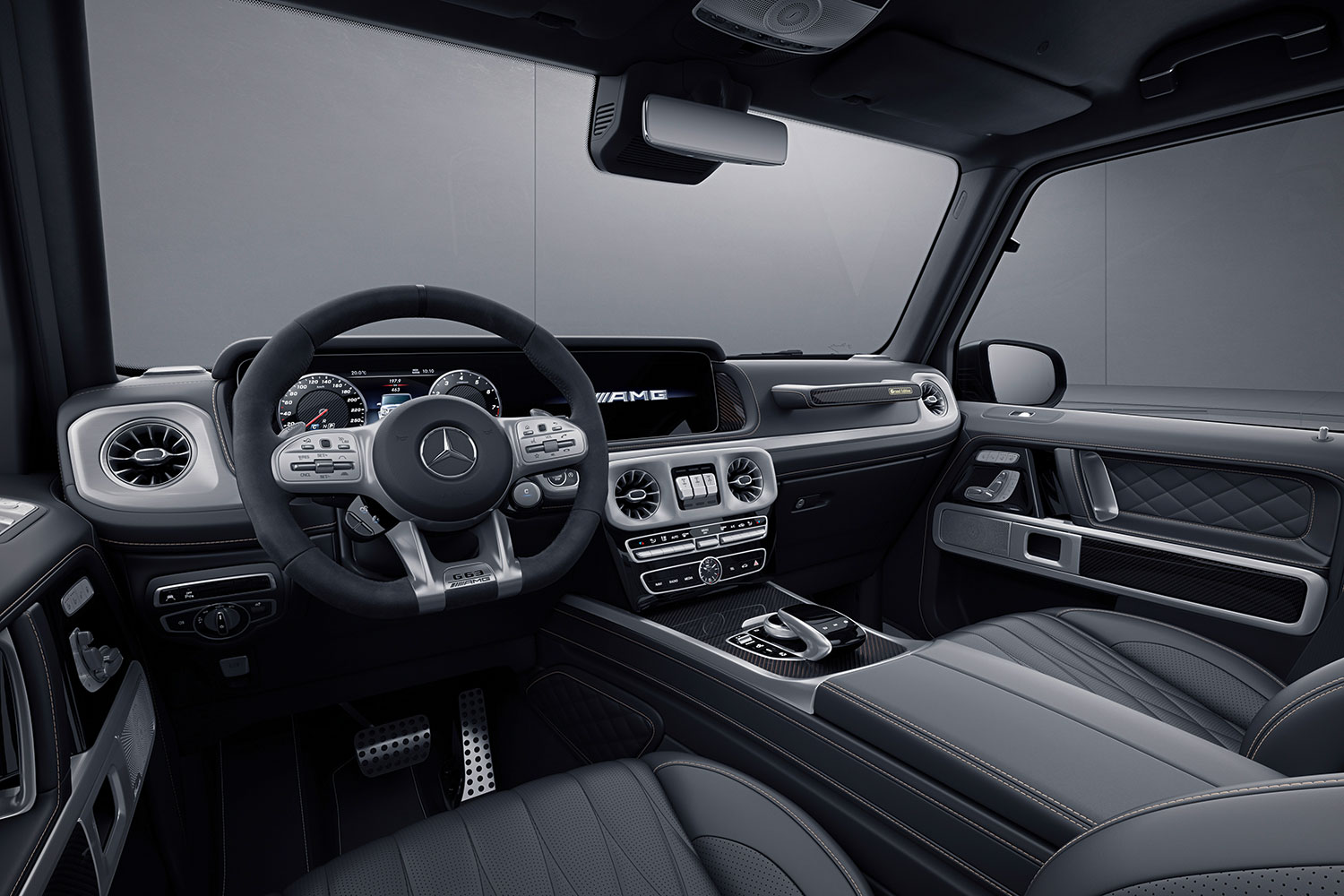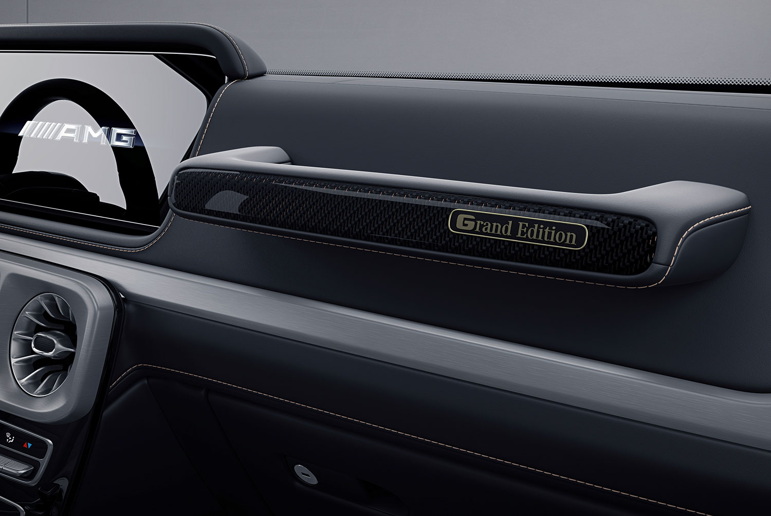Die beleuchteten “AMG”-Embleme auf den schwarzen Einstiegsleisten empfangen die Insassen mit einem Hauch von Noblesse. Die Sitze sind mit edlem Leder G Manufaktur Nappa schwarz bezogen und zeigen edle goldene Kontrastnähte. Plaketten mit goldenen AMG Logos und umlaufenden Akzenten sind geschmackvoll in die Lehnen integriert und unterstreichen die Exklusivität des Fahrzeugs. Die lederbezogenen Dachhaltegriffe strahlen Luxus aus, während die Griffeinlage auf der Beifahrerseite mit Carbon-Finish und kupferfarbenen Fadendetails sowie einer hochwertigen Plakette mit dem Schriftzug Grand Edition” glänzt. Das AMG Performance Lenkrad in DINAMICA Mikrofaser verfügt über eine Lenkradblende mit G 63 Plakette.